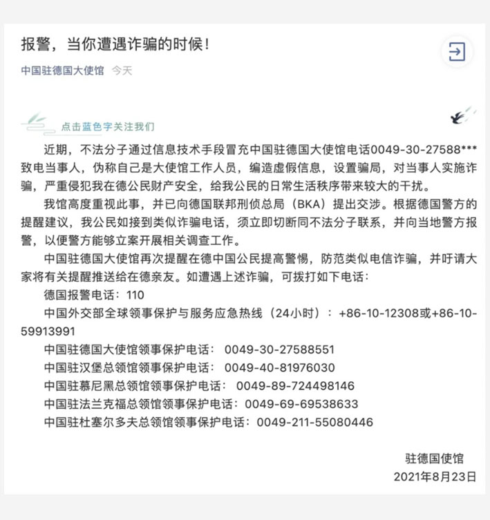 驻德国大使馆提醒:谨防不法分子冒充使馆名义进行电信诈骗