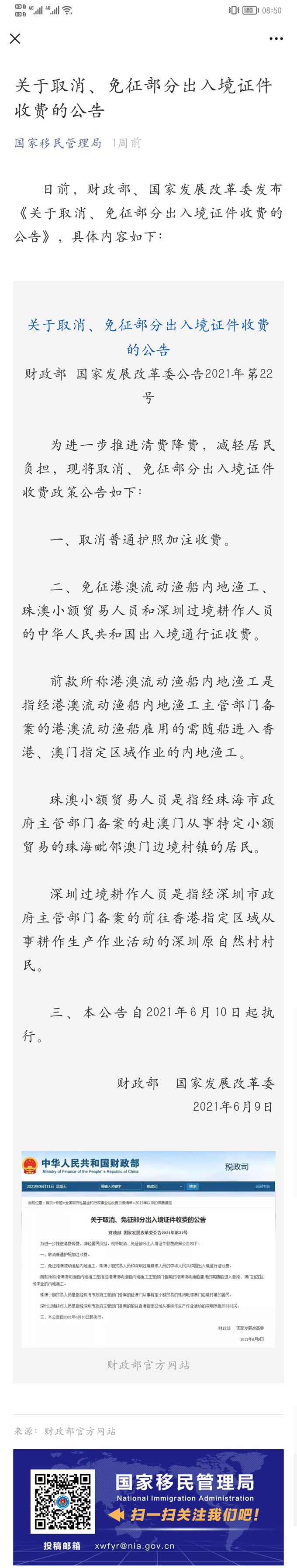 为进一步推进清费降费,减轻居民负担,现将取消、免征部分出入境证件收费政策公告如下: