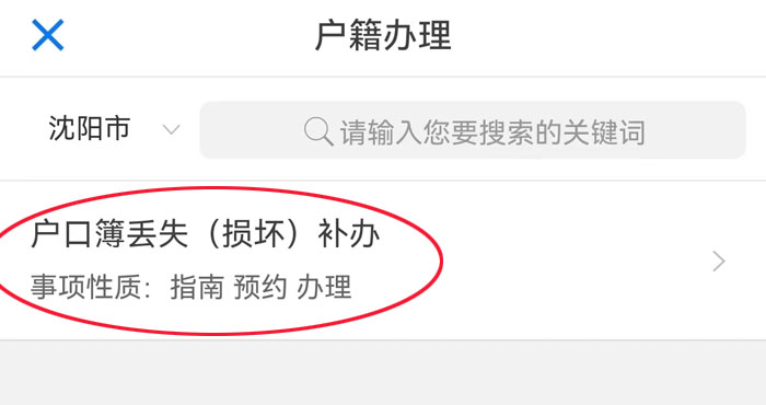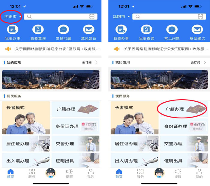1、进入到辽宁公安APP,注册并登录,在首页左上角选择所在地市,点击【户籍办理】例: