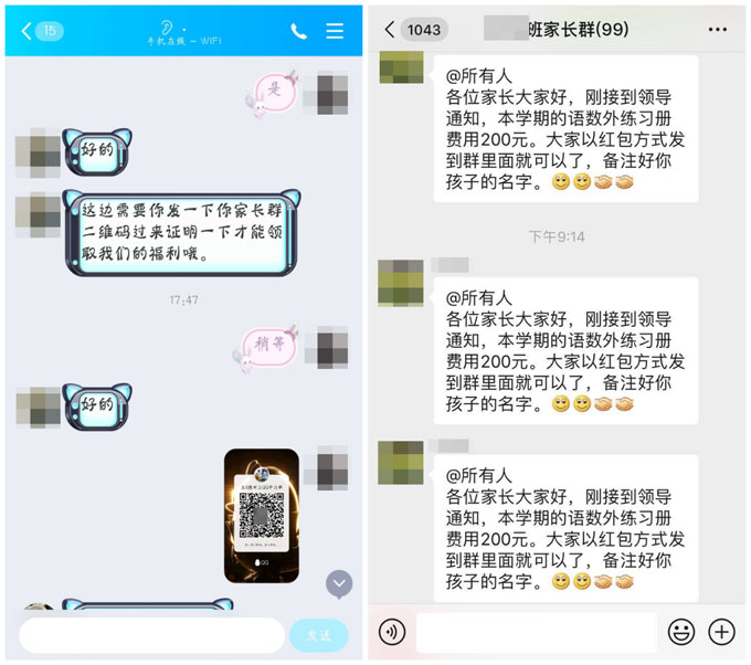 仿冒的初级阶段,是仿冒老师,骗子先是盗取孩子或家长帐号,然后把自己拉进家长群,再仿冒班主任以收取资料费的名义,骗家长转账。