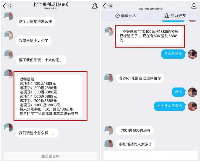 仿冒的中级阶段,是仿冒明星,骗子使用名人头像,昵称多为某某助理,动态是该明星出席各类活动的海报和日常照片。利用粉丝对爱豆的“感情”,先建立“粉丝福利群”吸引关注,达到足够人气后,再在群内发布返利信息。受害人转账后还会以名额不足、未成年需缴纳激活费等理由继续要钱。