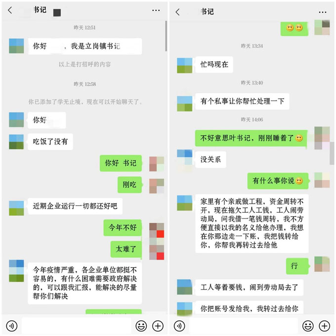 仿冒的高级阶段,是仿冒领导,骗子通过非法渠道获得受害人及其上级领导的信息,伪装成领导添加好友,嘘寒问暖获取信任。随后以亲朋急需资金、不方便从名下账户转账等理由,请求受害人代为转账,若受害人犹豫不决,对方还会制作虚假转账截图,进一步诱骗转钱。
