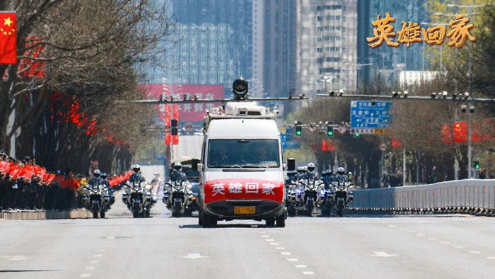 国旗照耀回家路,山河锦绣迎忠骨。今天的沈阳,猎猎红旗缀满街巷,楼宇大屏点亮“中国红”,万余名群众沿途静候,整座城市肃立以待。