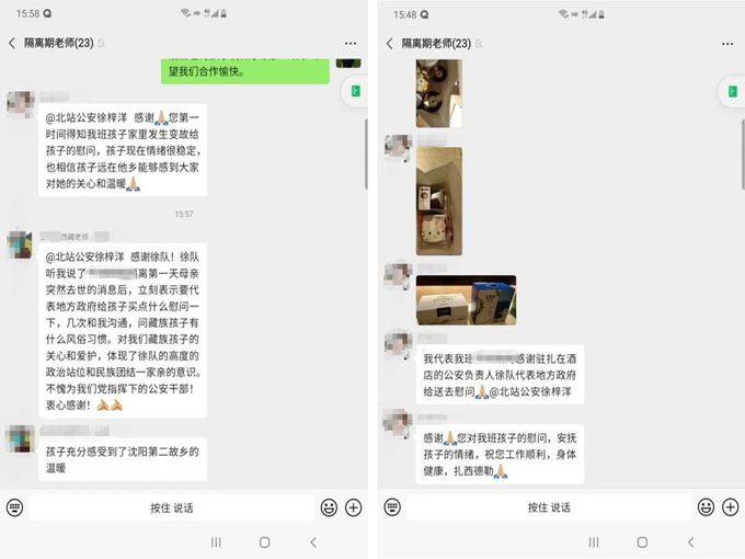 “感谢公安民警送来的慰问”“孩子现在情绪稳定,相信孩子远在他乡能够感受到大家对她的关心和温暖”“孩子充分感受到了沈阳第二故乡的温暖”......带队的几位老师在工作群内纷纷为民警的做法“点赞”。藏族女孩儿也在收到这些礼物后,用手机录制了感谢公安民警的短视频,发到了微信群中。藏族姑娘那带着乡音的感激话语,让所有人都受到感动。