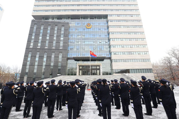 全体民警英姿挺拔、整装列队,伴随着清脆洪亮的口令,仪仗队员迈着铿锵有力的步伐,护卫中国人民警察警旗行进至升旗台。警旗迎着朝阳冉冉升起,全场人员面向警旗庄严敬礼,高唱《中国人民警察警歌》,歌声嘹亮,唱响忠诚本色。