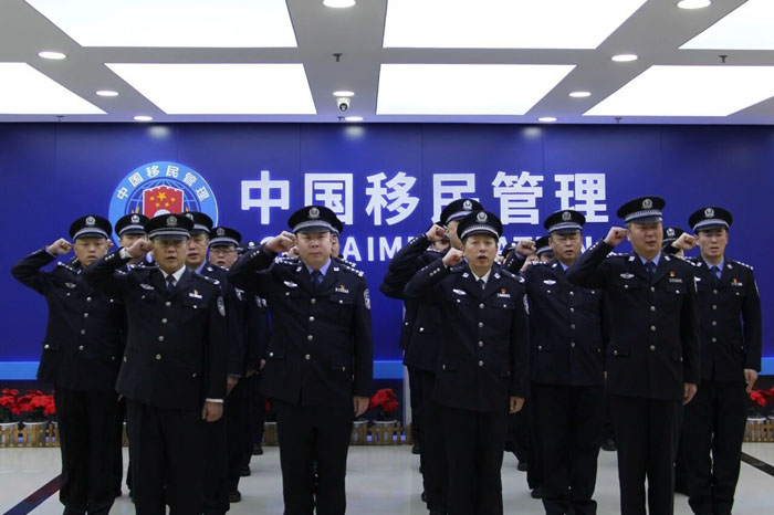 出入境管理支队举行向警旗宣誓活动,全体民警辅警高举右拳,齐声宣誓,凝聚警心力量、砥砺忠诚本色。