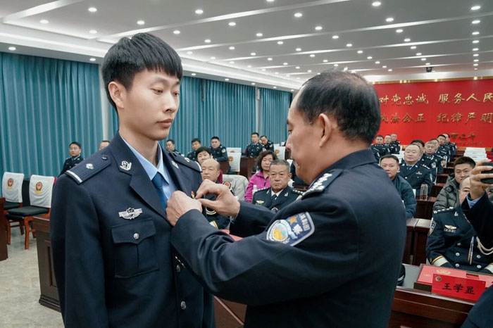 法库县局举办“荣光永续,薪火相承”民警荣退仪式,退休民警代表将伴随自己30年的警号佩戴在新警身上。
