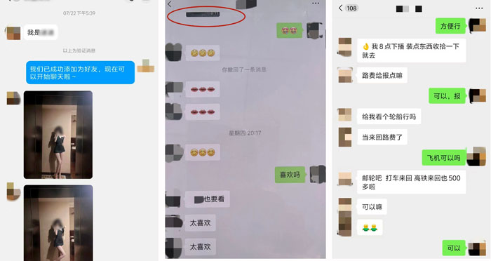 镜头前的美女主播温柔可爱,“大哥”看得正入迷就收到了“美女主播”的私信,双方随即添加好友。火箭、跑车、飞艇……“上头”的“大哥”频频送出礼物,之后便会收到“惊喜小视频”,“大哥”正沉浸在甜蜜的幻想中,殊不知已经深陷骗局,关爱有加的“嘘寒问暖”和“惊喜小视频”来自于该团伙的男运营。
