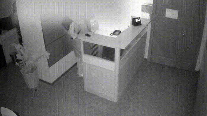视频显示,办公室门被用力撞开,一名背着双肩包的男子进入室内,该人举着手电筒四处翻找,桌面、抽屉、柜子……得手后,将笔记本电脑放进双肩包内,随后离开现场。